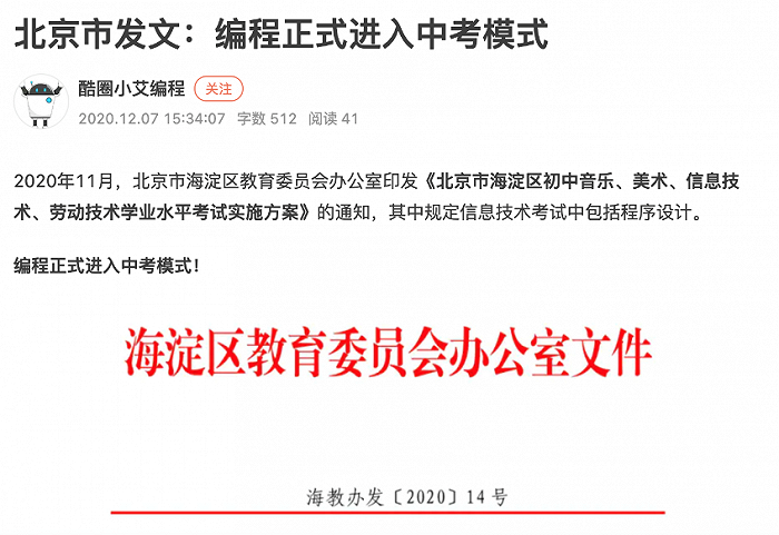 2020年11月,海淀区教委发布《北京市海淀区初中音乐、美术、信息技术、劳动技术学业水平考试实施方案》的通知。一时间,大量以“北京市发文:编程正式进入中考模式”为标题的文章被发布,点开相应链接,发布账号多为编程教育机构。