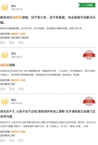 除了制造焦虑的质疑,蓝鲸教育查询发现,在黑猫投诉平台,编程猫存在涉及不退费,下单不发货、变向扣费等多项问题。