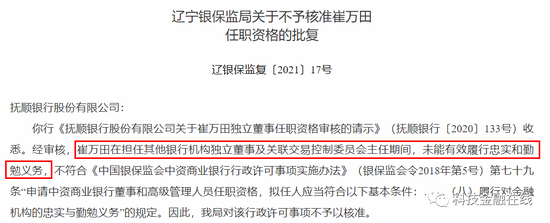 今年1月18日,辽宁银保监局披露的批复显示,因崔万田在担任其他银行独立董事及关联交易控制委员会主任期间,未能有效履行忠实和勤勉义务,被该局否掉了其担任抚顺银行独立董事的任职资格。