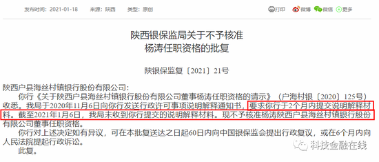 1月18日,根据陕西银保监局的披露,其本来已经收到了陕西户县海丝村镇银行关于杨涛担任董事任职资格的请示,后来该局向陕西户县海丝村镇银行发送行政许可事项说明解释通知书,要求其在2个月内提交说明解释材料。
