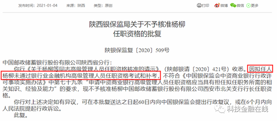 2021年首例“上位失利”的高层人员便是来自国有大行邮储银行。2021年1月4日,陕西银保监局披露一则批复,不予核准邮储银行陕西省分行一支行长的任职资格。