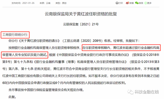 1月26日,云南银保监局发布披露,不予核准黄红波中国工商银行昆明关上支行行长的任职资格。