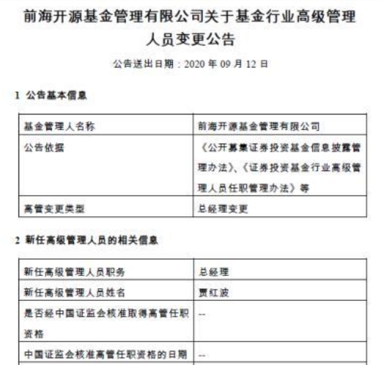 公告显示,前海开源基金原总经理蔡颖因个人原因于9月10日离任,贾红波出任公司总经理一职。
