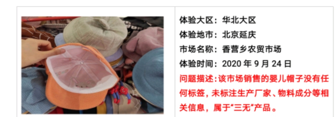 调查显示,36个市场中存在“三无”产品,涉嫌违规发生率为60%,相比2019年发生概率出现增长。而30个市场存在涉嫌假冒产品,问题发生率占比为50%,涉嫌假冒产品主要存在于服饰、鞋袜、食品等商品。在对北京延庆的香营乡农贸市场体验时,调查人员发现,该市场销售的婴儿帽子没有任何标签,未标注生产厂家、物料成分等相关信息,属于“三无”产品。不仅如此,该市场销售的服饰涉嫌仿冒FILA 品牌,其服装材料较差,且做工粗糙,有明显的线头等瑕疵,与真品差距较大。