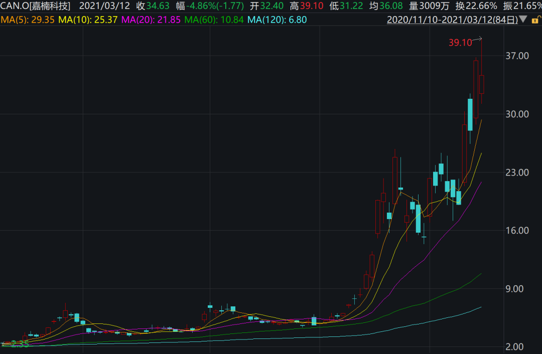 而随着今年比特币价格的水涨船高,嘉楠科技股价也是一路飙升。从2月至今仅一个半月的时间,股价已涨七倍有余,市值达54亿美元。
