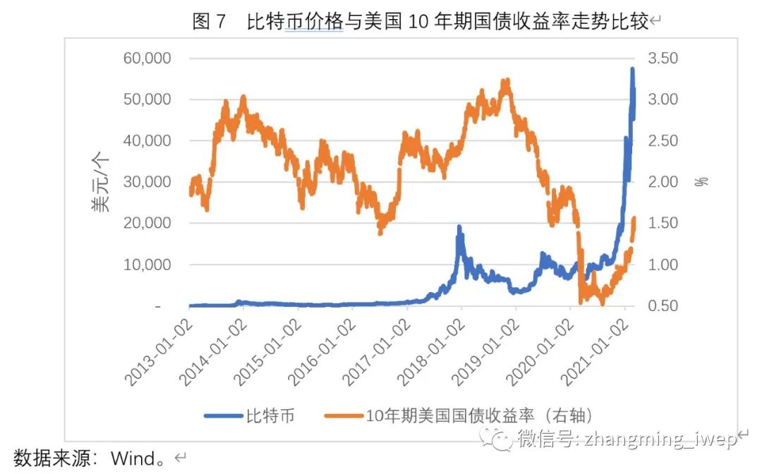 此外,美国长期利率变动也反映了全球流动性与融资成本变化。按理说,比特币价格应该与美国长期利率走势负相关。如图7所示,自2017年以来,比特币价格变动与美国10年期国债收益率变动之间存在一定的负相关,但相关性显著程度较弱,且领先滞后关系也在发生变化。例如,新冠疫情爆发后比特币价格的显著上涨,似乎与新冠疫情爆发后美国10年期国债收益率的显著下行有所关联。但美债收益率自2020年下半年以来的回升似乎尚未对比特币价格造成显著负面冲击。