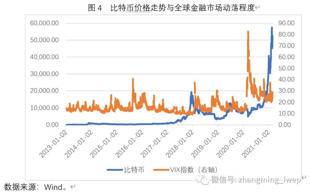 综上所述,比特币的性质更像一种典型的风险资产。我们不妨再考虑一下比特币价格与全球金融市场动荡程度之间的相互关系。如图4所示,总体来看,自2017年以来,比特币价格变动与全球金融市场动荡程度(VIX指数)呈现出显著的负相关。这进一步强化了关于比特币是一种风险资产的论断。