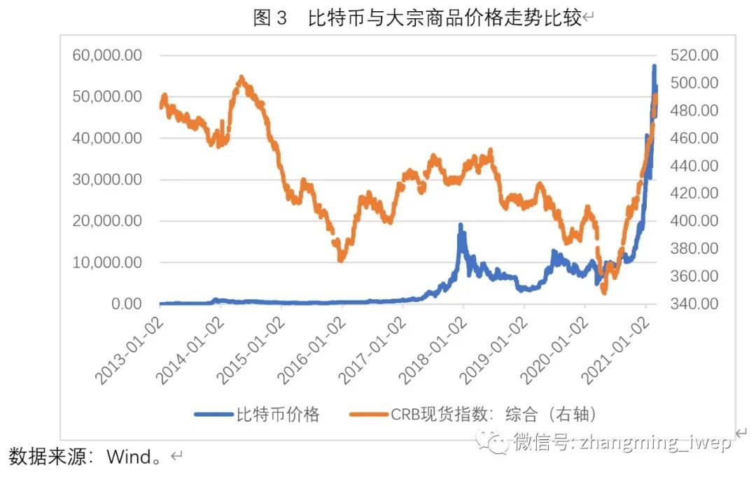 由于比特币与黄金价格的相关性从历史上来看并不稳定,我们可以再考察一下比特币价格与大宗商品价格之间的关系。如图3所示,自2017年以来,比特币价格走势与CRB大宗商品现货价格指数走势之间呈现出显著的正相关。
