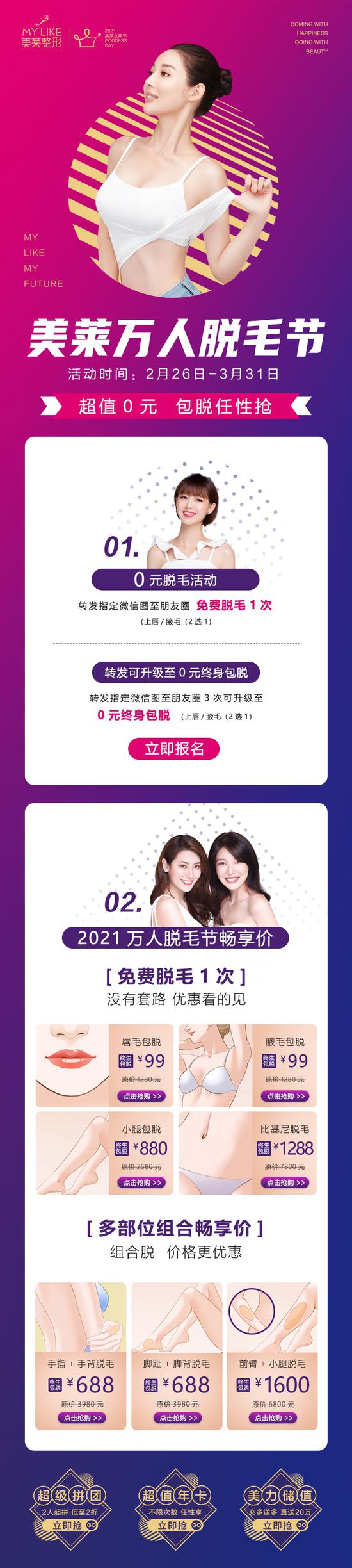 2月26日-3月31日,泉州美莱万人脱毛节火爆开启!0元终身包脱福利、多部位组合畅享超值价,还有一系列优惠活动等你来哦~现在“脱”光,这个夏天你才能惊艳全场!