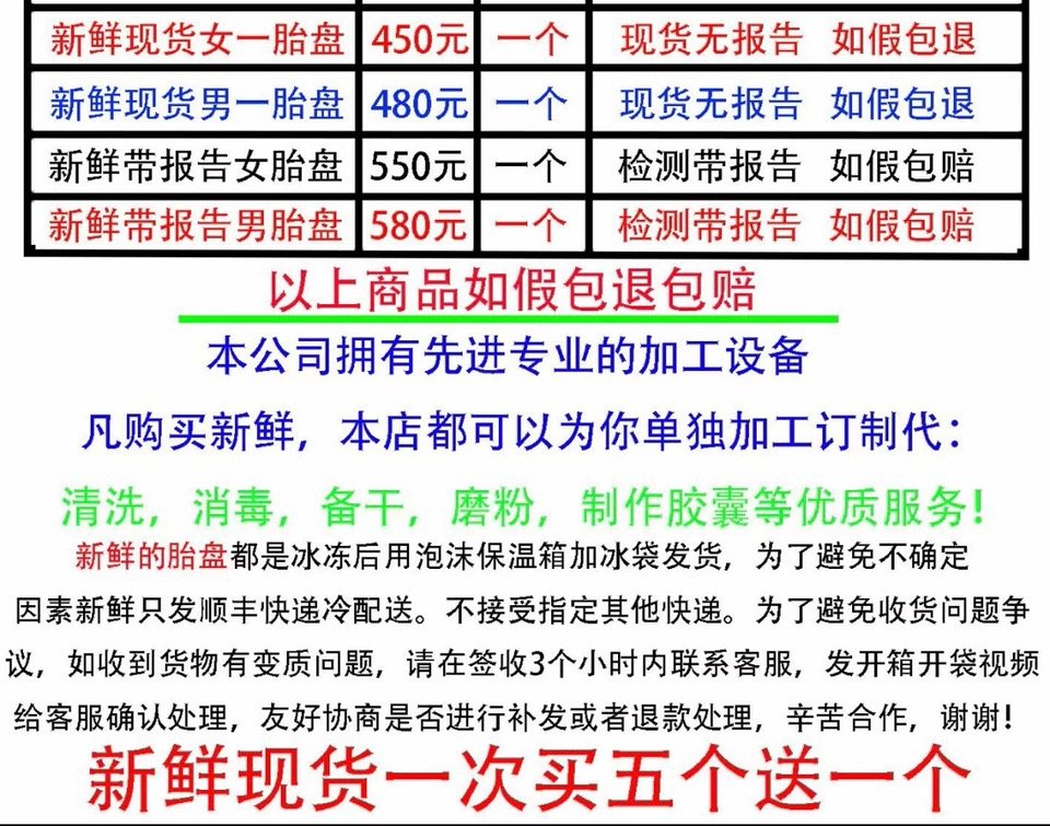 商家打出广告:“大量出售新鲜人体胎盘。”虽然标示价格为200元,但私聊是否有鲜货后,商家发来一张价目表。其中,鲜货分为男女两类,带报告与不带报告又是不同的价格:不带报告、男胎盘每个480元,女胎盘每个450元;检测带报告,男胎盘每个580元,女胎盘每个550元。