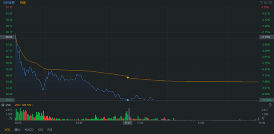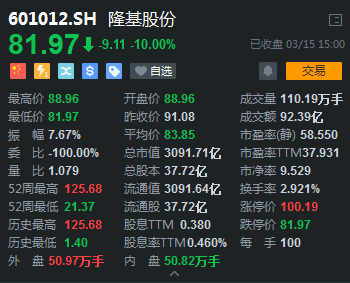 3月15日,机构抱团股再度走弱,“光伏茅”隆基股份(601012.SH)盘中摁死跌停,截至收盘,该股大跌10%跌停,报81.99元,成交额92亿元,最新市值高达3092亿元,一日蒸发226亿元。