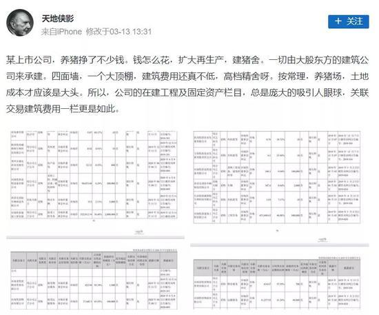 4、“天地侠影”还陆续发言,质疑牧原股份与关联企业河南牧原建筑工程有限公司(以下简称牧原建筑)之间的交易。“四面墙,一个大顶棚,建筑费用还真不低,高档精舍呀”,暗指牧原股份向牧原建筑支付了大量建筑费用。