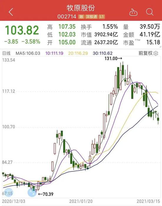 回顾近期牧原股份股价走势,2月22日,牧原股份盘中创出历史新高后,便一路跟随抱团股回调,截至3月12日,牧原股份的累计跌幅为15.15%,总市值蒸发超700亿元。