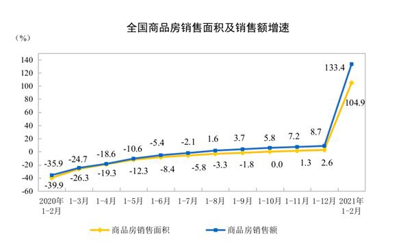 国家统计局数据显示,1-2月份,商品房销售面积17363万平方米,同比增长1.05倍;比2019年1-2月份增长23.1%,两年平均增长11.0%。其中,住宅销售面积增长1.08倍。商品房销售额19151亿元,同比增长1.33倍;比2019年1-2月份增长49.6%,两年平均增长22.3%。其中,住宅销售额增长1.44倍。