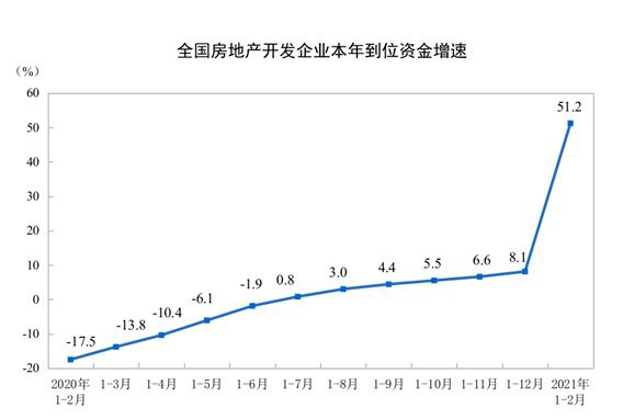 国家统计局数据显示,1-2月份,房地产开发企业到位资金30560亿元,同比增长51.2%;比2019年1-2月份增长24.7%,两年平均增长11.7%。其中,国内贷款5201亿元,增长14.4%;利用外资10亿元,下降14.0%;自筹资金8268亿元,增长34.2%;定金及预收款11002亿元,增长96.3%;个人按揭贷款4961亿元,增长63.7%。
