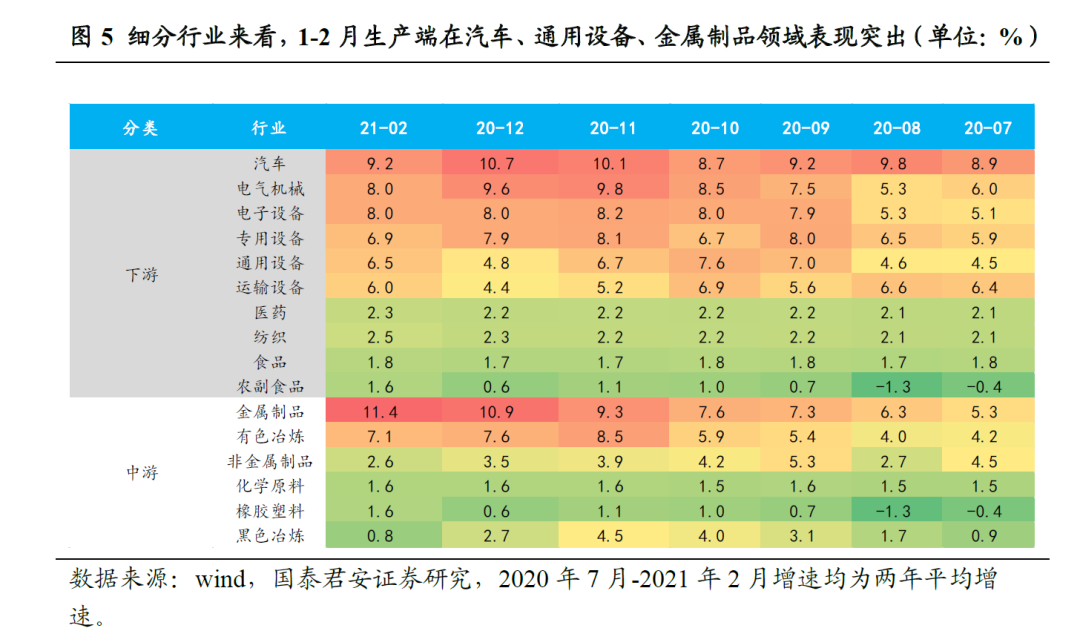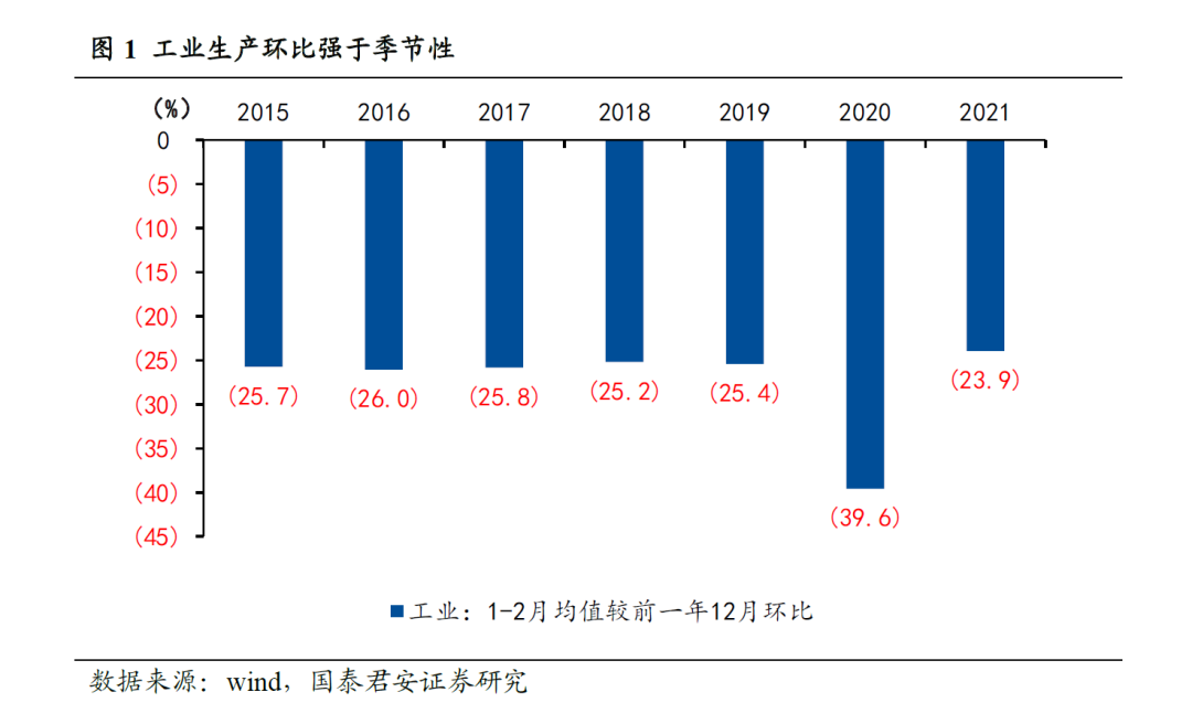 由于2020年1-2月疫情造成经济停摆,经济数据基数普遍较低,导致同比大多高增,基数效应对考察经济动能的变动产生比较大的干扰。可以考虑以往年1-2月环比增速的均值,对2020年1-2月经济数据进行修正,以剔除基数效应,但年份的选择会对往年环比增速均值造成比较大的干扰,因此这里并未采用这种方法。本文中我们主要采用另外两种方法来进行综合考察,第一种方法是2021年1-2月环比增速,与历年同期环比增速进行比对,考察目前环比增速较往年的强弱;第二种方法是考察近几个月两年平均增速,并进行前后比对,比如2021年1-2月两年平均增速为2021年1-2月数据与2019年1-2月数据累计同比的两年几何平均,2020年12月两年平均增速为2020年12月与2018年12月累计同比的两年几何平均,若无特殊说明,本文后续两年平均增速均采用这种计算方法。