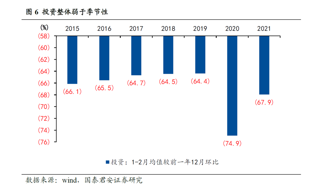 1-2月固定资产投资两年平均增速为1.7%,低于12月的6.4%,从环比角度来看,1-2月平均值环比也明显低于季节性均值,整体弱于市场预期,主因在制造业和基建拖累。