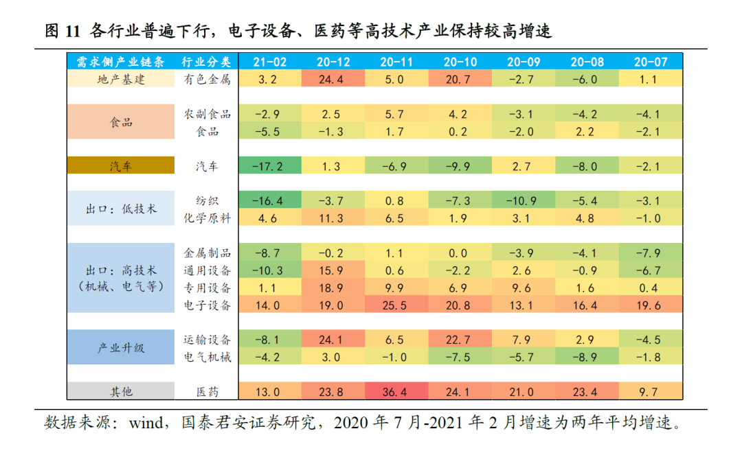 (3)制造业:制造业走弱,我们认为属于短期扰动。高技术链条的投资表现仍强于整体。分行业来看,电子设备、医药等高技术产业相对较好。
