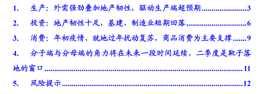 (一)1-2月数据中,生产端超市场预期,背后是出口景气带来的强支撑,地产韧性十足,制造业投资、基建不及预期,消费修复有所放缓: