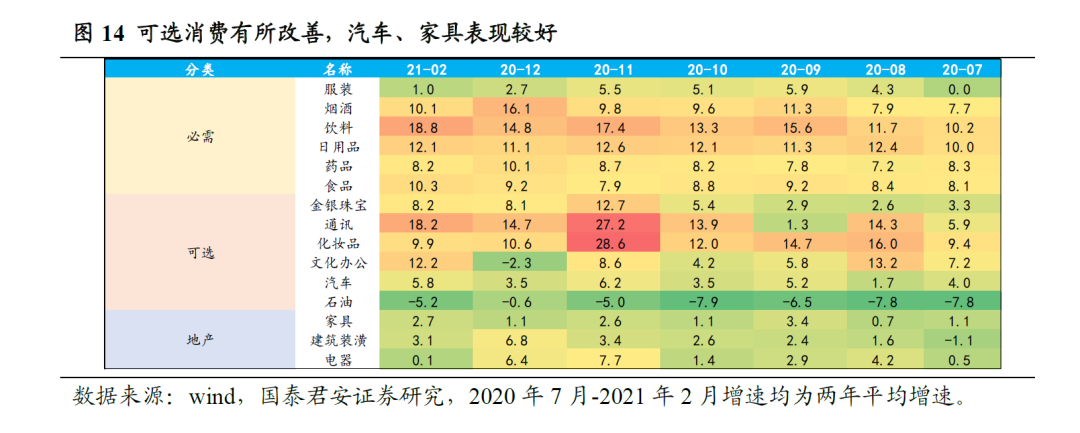 分项来看,可选消费中汽车、家具表现突出。对两年平均增速进行比较,必需品保持稳定,食品、日用品、饮料延续高增。可选消费多数上升,通讯设备两年平均增速跳升至18.2%。地产类消费中家具表现突出,装潢、电器小幅回落。汽车表现亮眼,原油消费偏弱。