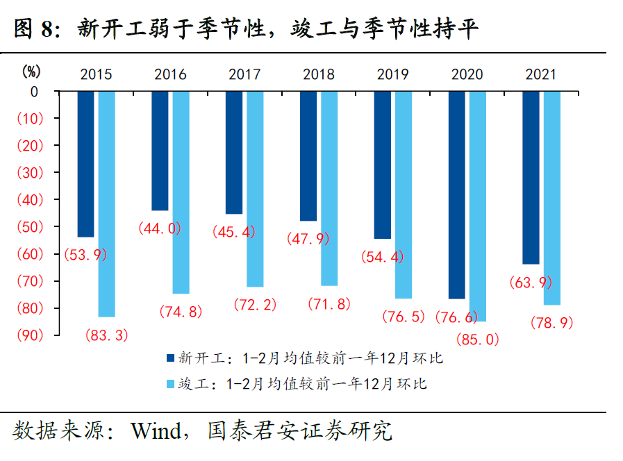 基建投资持续回落,不及预期。广义基建两年平均增速-0.7%,较12月3.4%明显回落,从季节性角度来看,广义基建环比增速也弱于季节性均值,环比动能依然在走弱。2021年财政政策退坡幅度有限,二季度政府债券供给提升,资金逐渐到位,我们认为基建投资动能将有所回升。