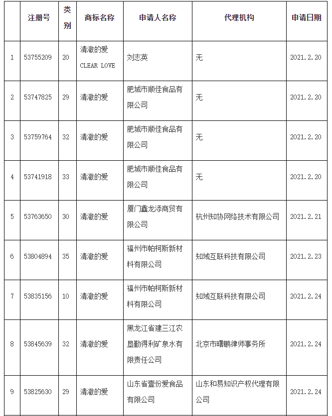3月15日,国家知识产权局公布《关于依法驳回“清澈的爱”等17件商标注册申请的通告》。