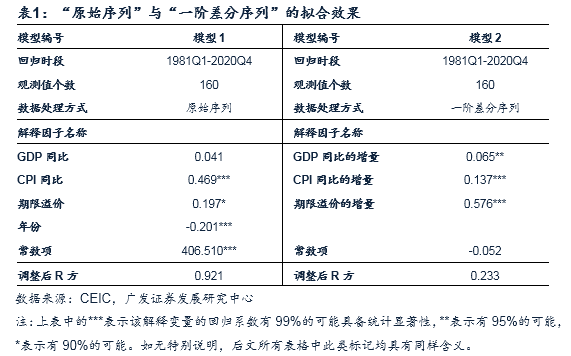 依前文所述,我们对全样本原始序列与一阶差分序列分别回归,结果如下: