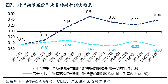 不同模型对期限溢价峰值的预测有所不同,但只影响十年期美债收益率变化的幅度,没有根本改变其拐点和路径。方案一即从最近三次期限溢价触底反弹的情形推算,期限溢价很可能在今年三季度升至逾0.5%的阶段性高位后开始回落,明年一季度或于0.2%附近触底,而后在二季度反弹至0.4%附近,反映市场风险偏好较低;方案二从最近三次美欧经济触底回升的情形推测,期限溢价未来一年半都可能围绕-0.4%的水平窄幅波动,反映市场风险偏好较高(图7)。