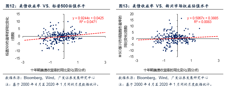 第一,上个世纪九十年代前,十年期美债收益率上升往往意味着美股向下调整,而在这之后,利率上升均对美股产生正面的影响。新兴市场股市时间相对较短,从九十年代以后的数据来看,利率上升的影响也是正面的。