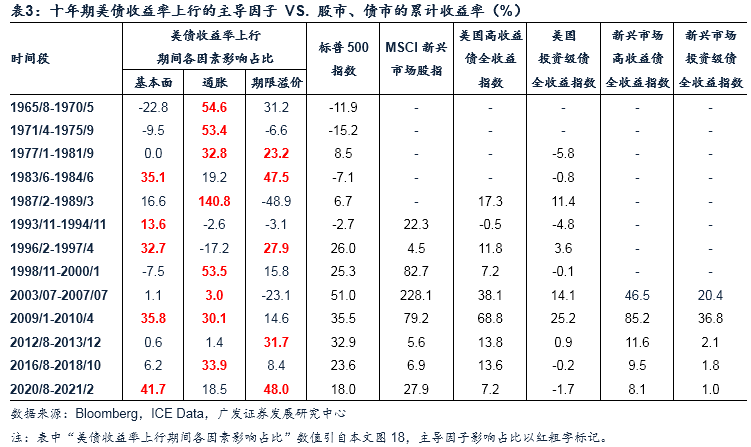 在不同时期,美债收益率影响因子的变化,同样也会影响大类资产的收益表现(见下一页,表3)。从过去的经验来看,主要表现为以下几个方面:
