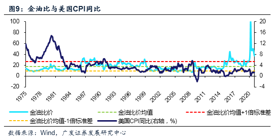 以原油、工业金属、农作物为代表的大宗商品价格近期快速攀升,与全球通胀预期上行有直接联系。在2020年9月9日所发报告《价格意外:谁是下一个?》中,我们指出,当金油比价处于历史均值+1倍标准差以上的高位时,金价下跌与油价上涨的可能性很大(图9)。历史上,国际金价走势通常领先美国CPI同比变化约一年左右,而油价走势则与中美PPI同比变化高度相关。进入2021年的短短两个月间,以纽交所原油期货连续合约为代表的国际油价接连突破每桶50美元和60美元关口,COMEX金价从1900美元以上下跌至1700美元附近,金油比价快速收敛,预示全球通胀短期内会明显抬升。