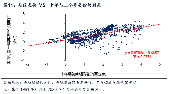 期限溢价上升,将推动收益率曲线进一步陡峭化。同样从过去60年左右的时间看,期限溢价与美债利差(十年期减三个月期)高度正相关(图11)。如果期限溢价从现有水平继续上升,很可能会将十年期美债收益率推高到接近2%的水平。