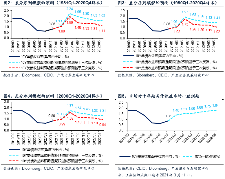 基于差分序列模型及其不同时段下的回归结果,代入各因子的客观预期,我们得到如下十年期美债收益率走势曲线(见下一页,图2至4):