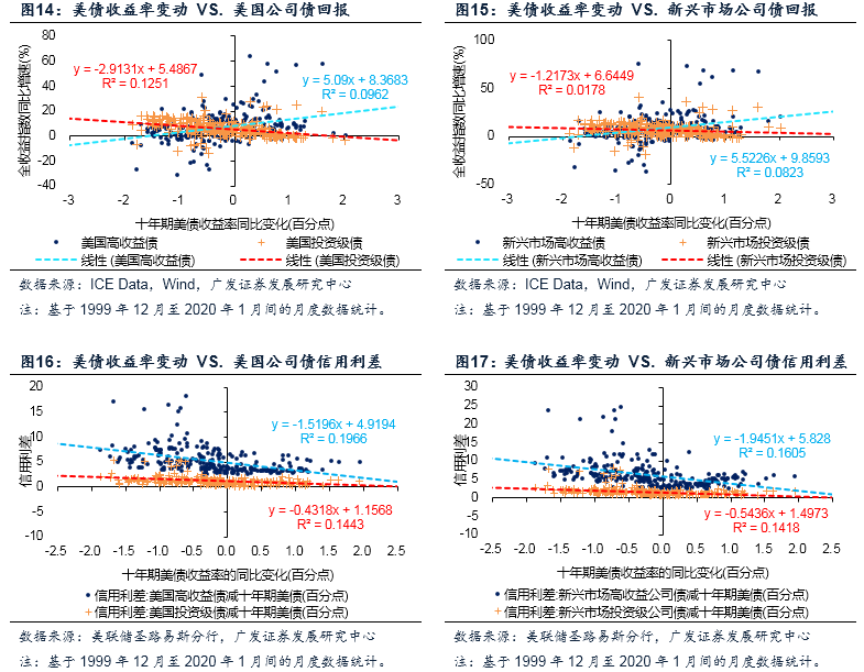 美债收益率上行总体利空债市,但从综合收益率(价格变动与利息收入总和)看,主要利空投资级债,高收益债甚至略有受益。过去20年,十年期美债收益率与ICE美银投资级债券总收益指数同比呈负相关关系,对新兴市场投资级债的综合回报也有类似的影响;而对高收益债的综合收益率都是弱正相关(见下一页,图14、15)。同样地,这样的弱相关性不具统计意义上的显著性。