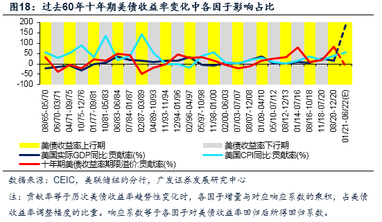 历史上,美债收益率变化受通胀影响最大。过去60年,通胀升降是主导美债收益率涨跌的关键因子,在13轮收益率上行期内,通胀影响力有8次占优,而在12轮下行期,通胀亦有8次排在各影响因子首位(图18)。总体而言,经济基本面的影响明显偏小,仅有4次主导收益率上行,3次主导收益率下行,反映与二战后美国经济增速平稳下行的基本面。此外,期限溢价变动也直接影响美债收益率波动,尤其是在经济衰退与复苏周期,期限溢价的影响力往往超过经济基本面,有时甚至超越通胀。