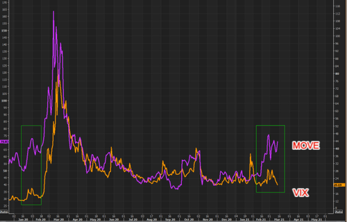 目前,针对标普500的VIX恐慌指数和针对美债的MOVE恐慌指数发生了明显背离。