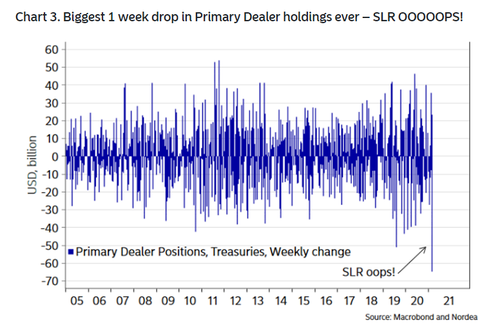 分析师称,投资者还担心即将实施的SLR监管调整,这可能促使华尔街大型银行减少证券持有量和放贷。SLR规则要求大银行持有更多资本。
