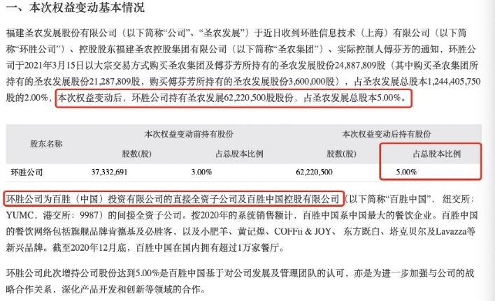 今日晚间,圣农发展发布公告称,公司于近日收到环胜信息技术(上海)有限公司(“环胜公司”)、控股股东福建圣农控股集团有限公司(“圣农集团”)、实际控制人傅芬芳的通知,环胜公司于2021年3月15日以大宗交易方式购买圣农集团及傅芬芳所持有的圣农发展股份2488.7809万股(其中购买圣农集团所持有的圣农发展股份2128.7809万股,购买傅芬芳所持有的圣农发展股份360万股),占圣农发展总股本的2.00%,此次权益变动后,环胜公司持有圣农发展6222.05万股股份,占圣农发展总股本5.00%。