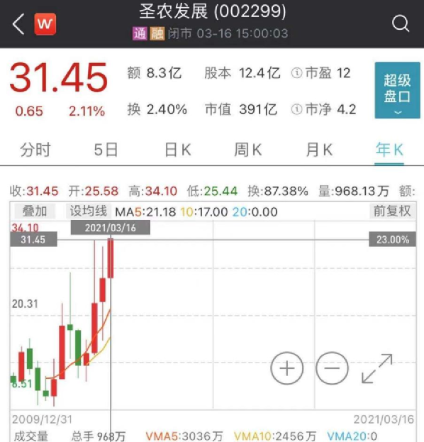 截至今日收盘,圣农发展涨2.11%,报31.45元/股,总市值391亿元。今年以来,股市震荡加剧,但圣农发展股价已涨23%。
