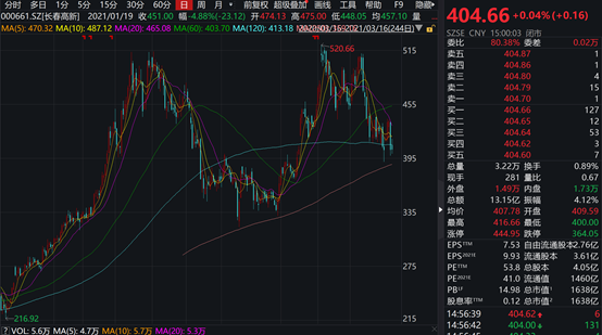 截至3月16日收盘,长春高新报收404.66元/股,总市值为1638亿元。