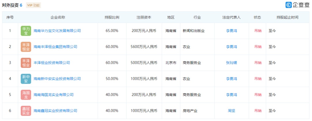乐居财经查阅获悉,目前李勇鸿对外投资了6家公司,都处于吊销状态;而他担任法人的10家企业中,也有9家已吊销,仅有广东盛世福地实业开发有限公司,处于在业状态。看似一片“凋零”。