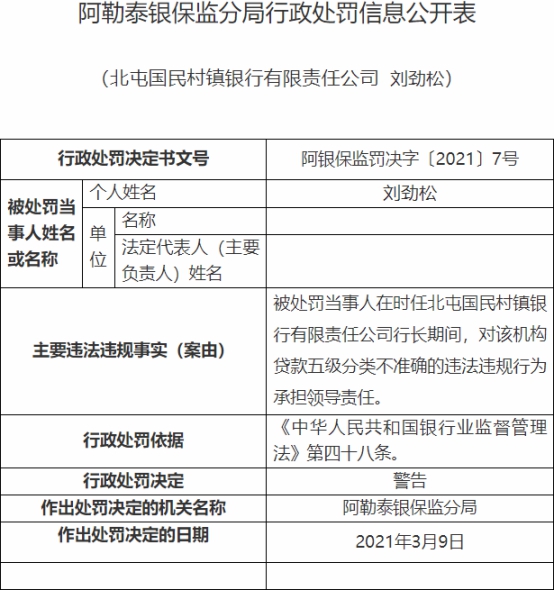 刘劲松在时任北屯国民村镇银行行长期间,对该机构贷款五级分类不准确的违法违规行为承担领导责任。阿勒泰银保监分局于2021年3月9日决定对刘劲松警告,行政处罚依据为《中华人民共和国银行业监督管理法》第四十八条。