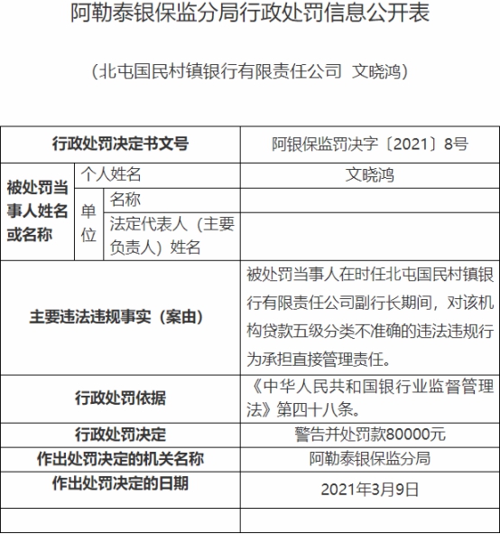 文晓鸿在时任北屯国民村镇银行副行长期间,对该机构贷款五级分类不准确的违法违规行为承担直接管理责任。阿勒泰银保监分局于2021年3月9日决定对文晓鸿警告并处罚款8.00万元,行政处罚依据为《中华人民共和国银行业监督管理法》第四十八条。
