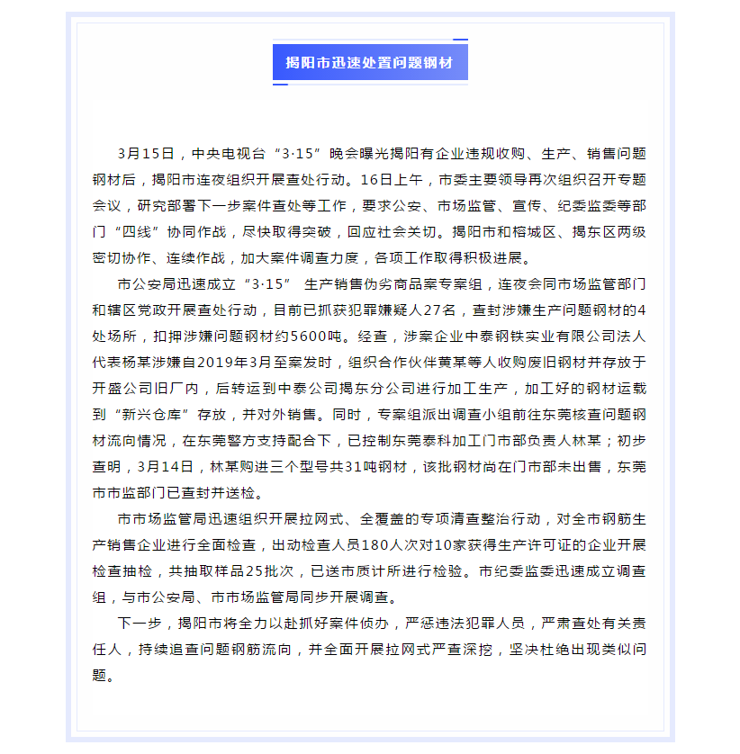 3月15日,中央电视台“3·15”晚会曝光揭阳有企业违规收购、生产、销售问题钢材后,广东揭阳市连夜组织开展查处行动。