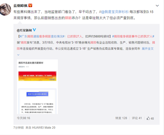 对此有网友表示,每次都等到3.15来揭穿事情,那么前面销售出去的钢筋咋办?这是牵扯就太大了但必须严查到底。