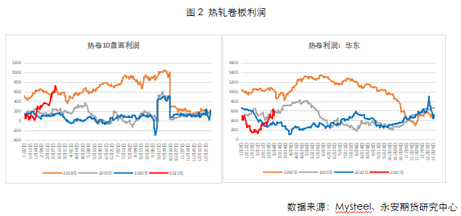 受到“碳达峰”和“碳中和”的影响,钢厂利润一路走扩,由于政策没有公布具体方案,因此市场普遍认为10合约将受到更多政策影响,其盘面利润较05合约有更大程度的涨幅,目前已达到18年的水平。