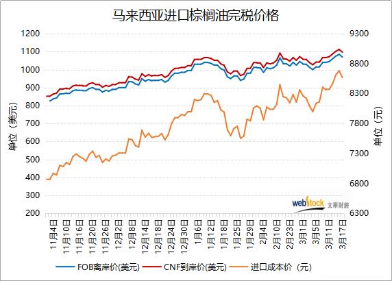 3月17日马来西亚棕榈油离岸价为1070美元,较上日跌15美元,进口到岸价为1097美元,较上日跌15美元,进口成本价为8568.88元,较上日跌112.5元,终结四连涨。因豆油期货走疲,且市场预期棕榈油产量将大幅回升,马来西亚BMD毛棕榈油期货周二扭转早盘涨势,结束为期9天的上涨,棕榈油进口成本跟盘回调。