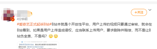 随后,#爱奇艺正式起诉B站#冲上热搜,引发网友讨论。有网友表示,B站本就是个开放性平台,用户上传的视频只要通过审核,就会在B站看到,如果是用户上传造成侵权,应当联系上传用户,要求删除并赔偿,而不是让B站负全责,不是吗?