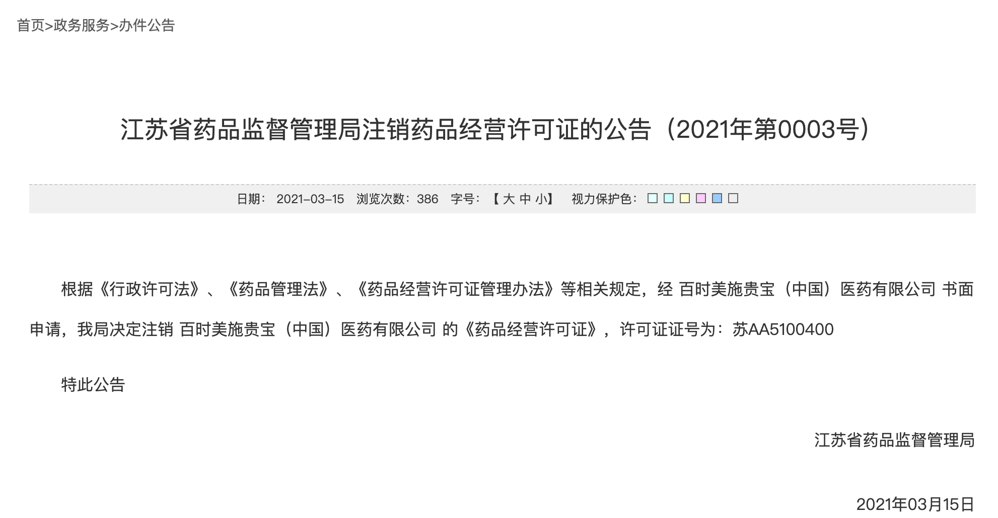 3月15日,江苏省药监局官网发布公告,称经百时美施贵宝(中国)医药有限公司书面申请,江苏省药品监督管理局决定注销百时美施贵宝(中国)医药有限公司的药品经营许可证。