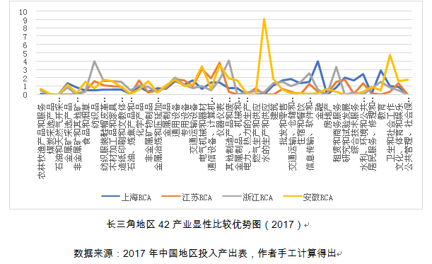 长三角一体化是完善国家价值链的关键一步,对长三角地区的赋能分工意义重大。而如何做到精准赋能、合理分工仍是一大难题。欲实现对地区的精准赋能,首先应识别地区的比较优势,找出优势产业。在区域经济一体化背景下,对比较优势的判定还应考虑到区域协同发展这一目标,找出最能带动周边地区经济发展的产业。下面给出了江浙沪皖四省份2017年各行业显性比较优势(RCA)水平。由此可以观察某一行业的配套产业在哪一省份发展得更加完备,找出四省份各自的优势产业,实现产业精准赋能。